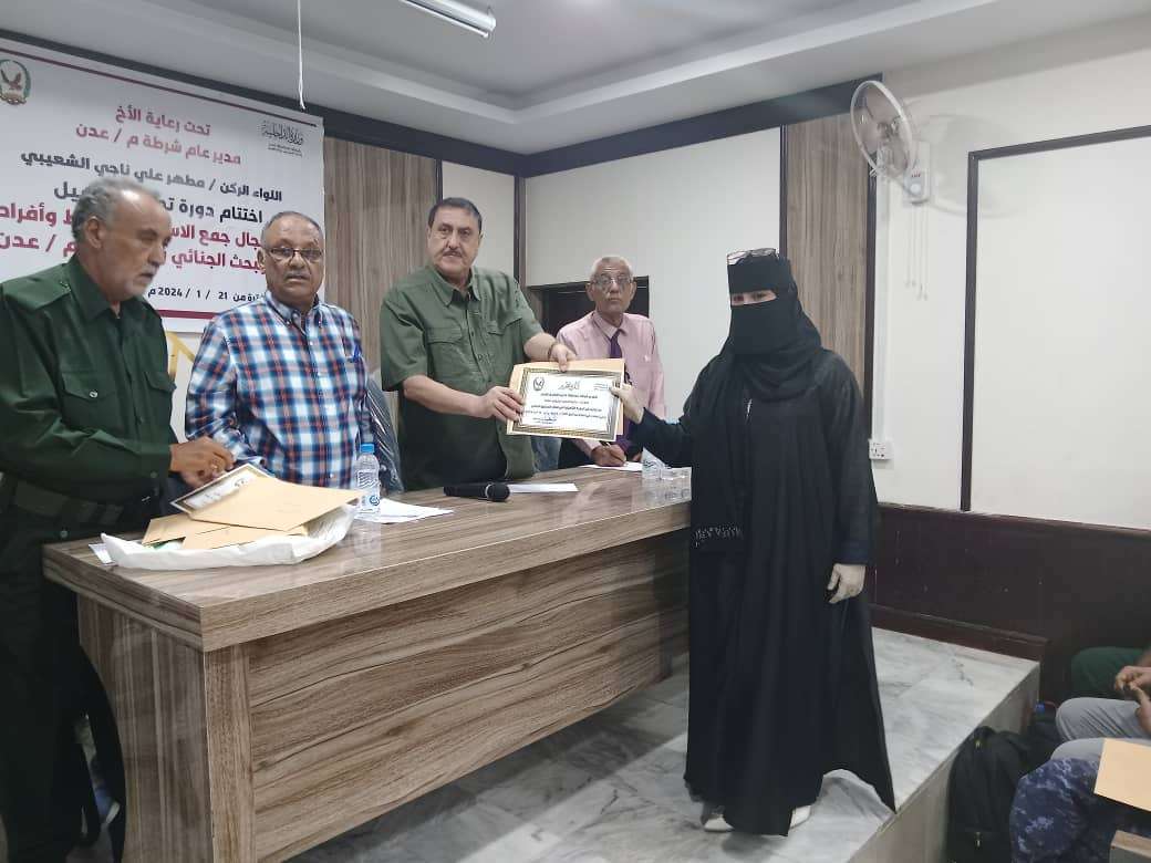 كرم مدير أمن العاصمة عدن اليوم، عدد من ضباط وافراد إدارة البحث الجنائي، بعد اجتيازهم الدورة التدريبية تحت عنوان "التحق...