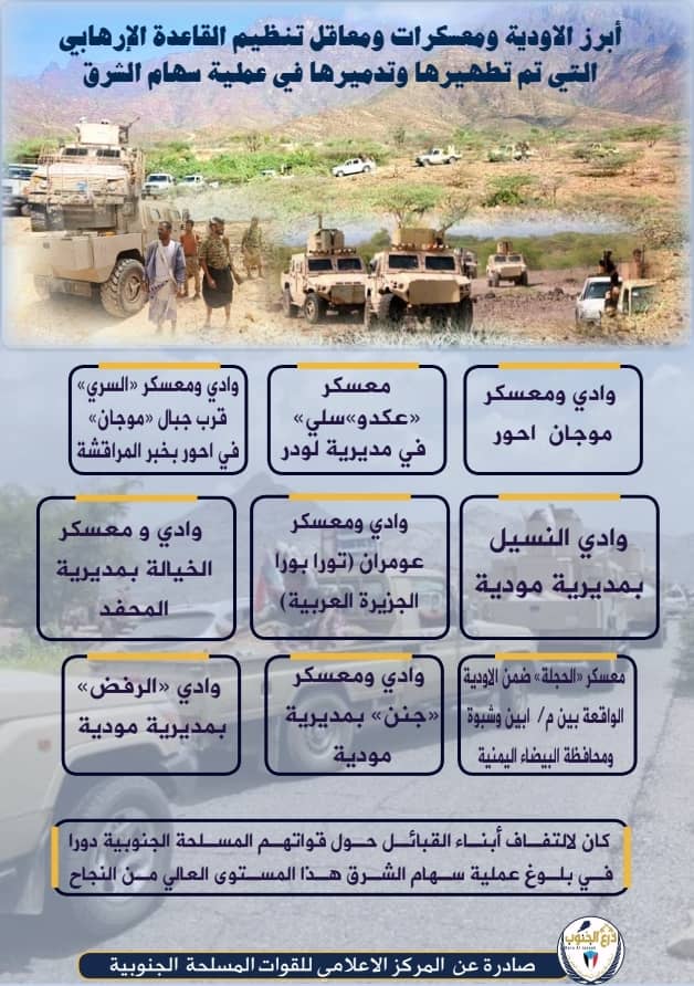 انفوجرافيك... ابرز الأودية ومعسكرات تنظيم القاعدة الإرهابي التي تم تطهيرها في عملية سهام الشرق