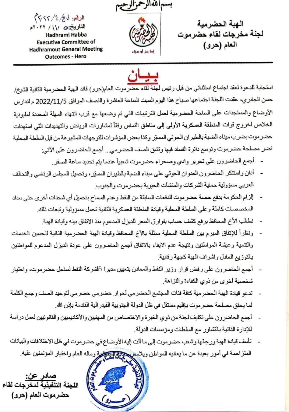 استجابة للدعوة لعقد اجتماع استثنائي من قبل رئيس لجنة لقاء حضرموت العام (حرو) قائد الهبة الحضرمية الثانية الشيخ/ حسن الجا...