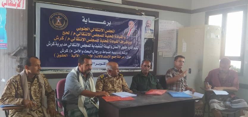 أقامت إدارة حقوق الإنسان بالهيئة التنفيذية للمجلس الانتقالي الجنوبي في مديرية كرش بمحافظة لحج، اليوم السبت، ورشة تدريبية ل...