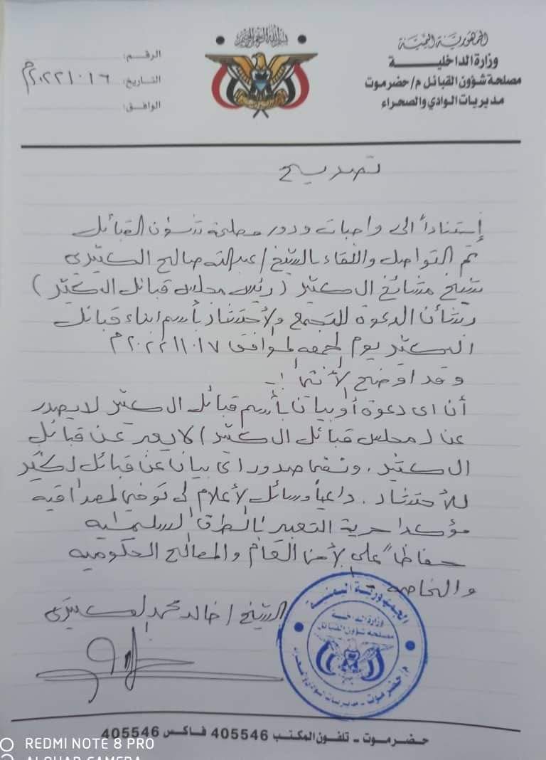 نفى الشيخ عبدالله صالح الكثيري شيخ مشائخ ال كثير صدور إي بيان عن قبائل ال كثير للاحتشاد والتجمع يوم غداً الجمعة والذي دعا...