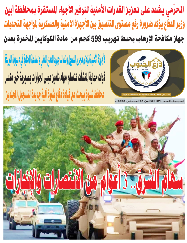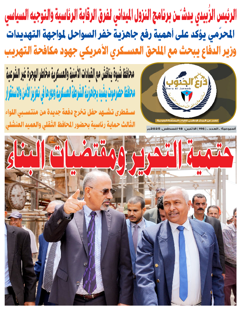 تصفح العدد (116) من صحيفة درع الجنوب الصادر اليوم الاثنين الموافق 18 أغسطس 2025م |
