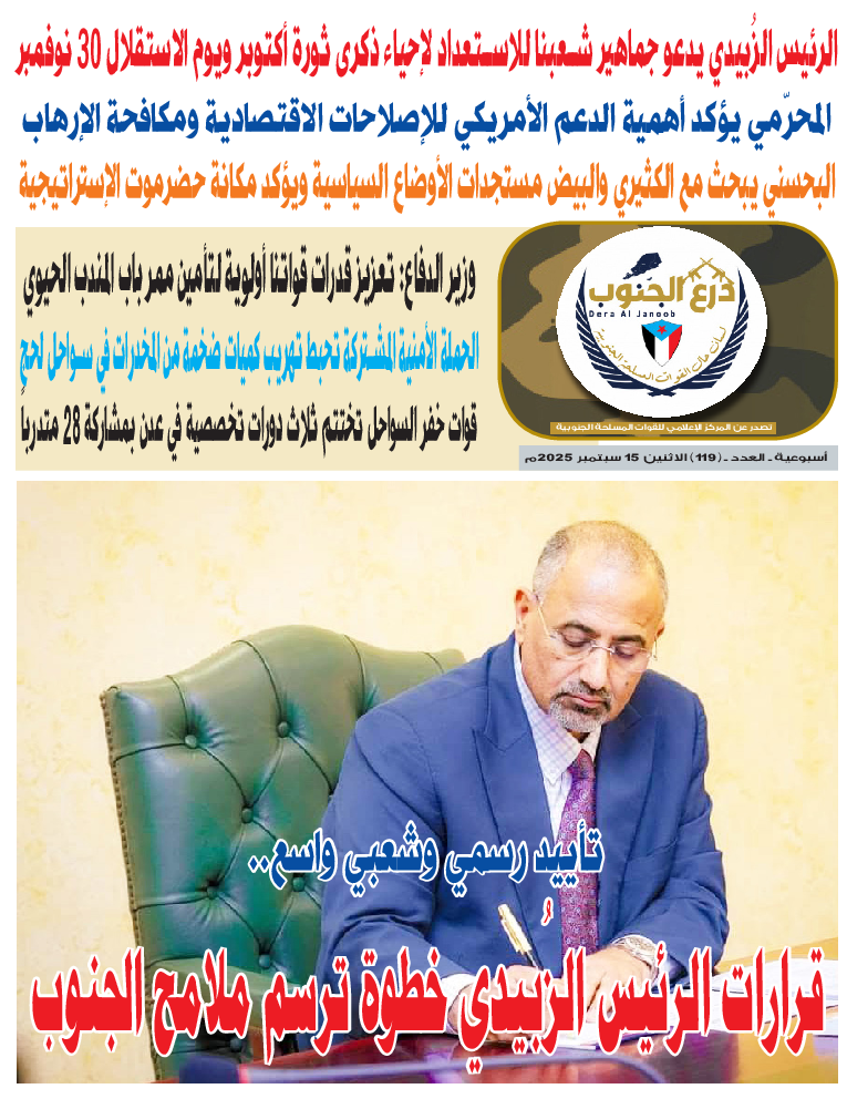 تصفح العدد (119) من صحيفة (درع الجنوب ) الصادر اليوم الاثنين الموافق 15 سبتمبر 2025م |