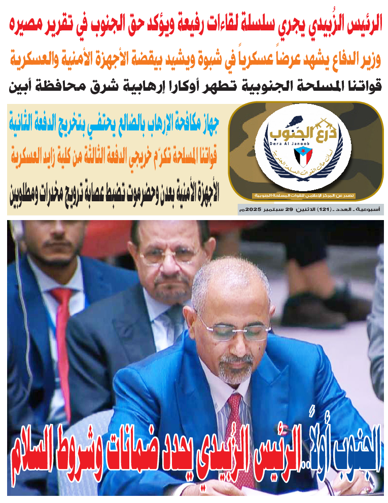 تصفح العدد (121) من صحيفة (درع الجنوب ) الصادر اليوم الاثنين الموافق 29 سبتمبر 2025م |