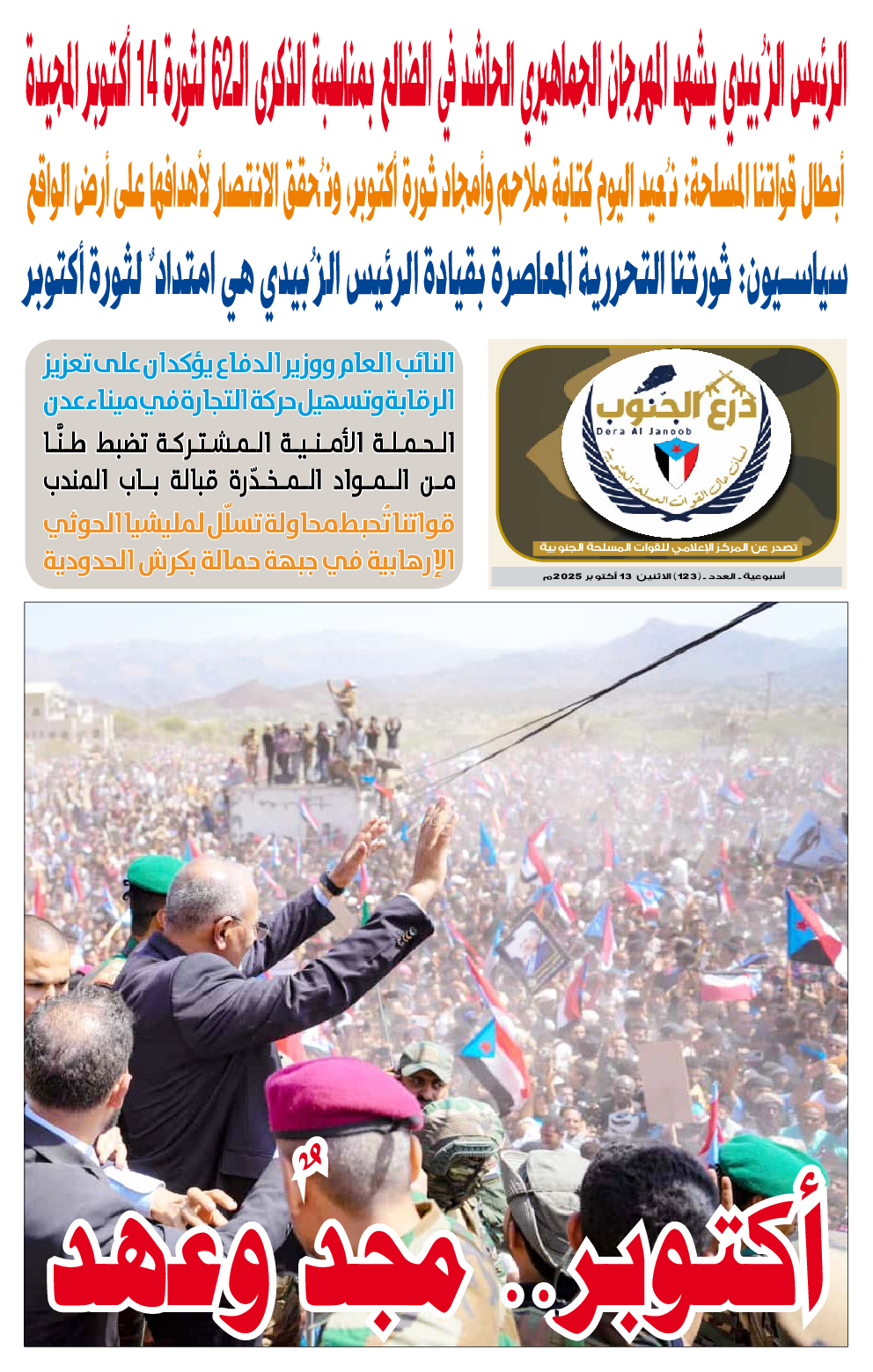 تصفح العدد (123) من صحيفة (درع الجنوب) الصادر اليوم الاثنين الموافق 13 أكتوبر 2025م |
