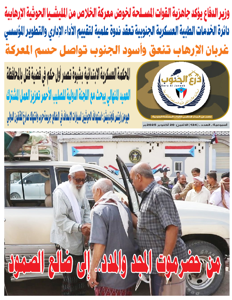 تصفح العدد (124) من صحيفة (درع الجنوب) الصادر اليوم الاثنين الموافق 20 أكتوبر 2025م |