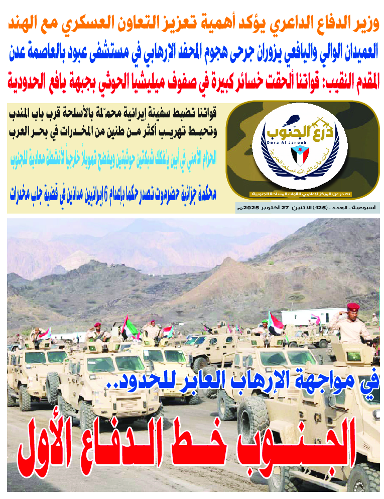 تصفح العدد (125) من صحيفة (درع الجنوب) الصادر اليوم الاثنين الموافق 27 أكتوبر 2025م |