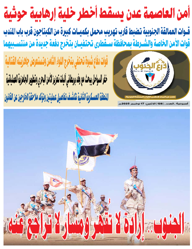 تصفح العدد (128) من صحيفة (درع الجنوب) الصادر اليوم الاثنين الموافق 17 نوفمبر 2025م |