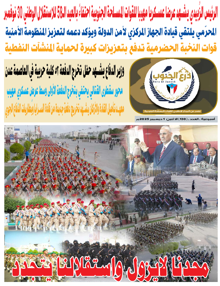 تصفح العدد ( 130 ) من صحيفة ( درع الجنوب ) الصادر اليوم الاثنين الموافق 1 ديسمبر 2025م |