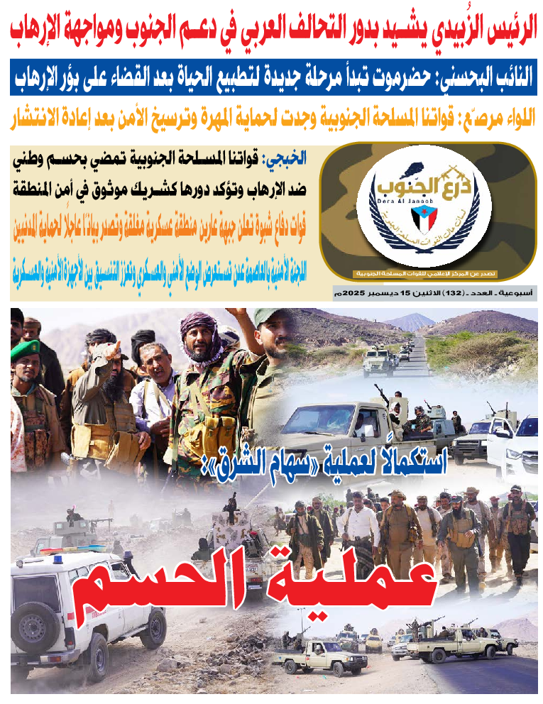 تصفح العدد ( 132) من صحيفة ( درع الجنوب ) الصادر اليوم الاثنين الموافق 15 ديسمبر 2025م |