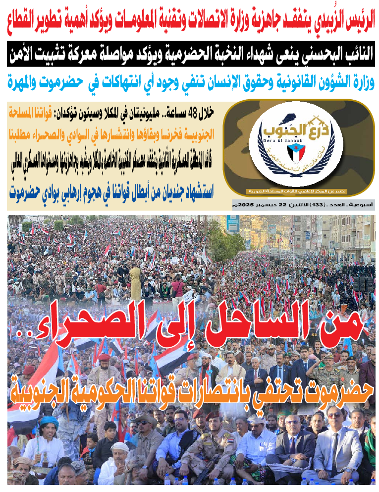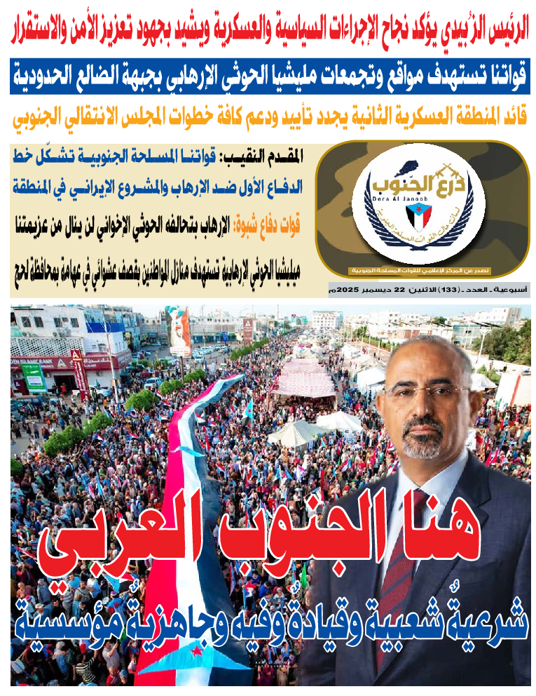 تصفح العدد ( 133) من صحيفة ( درع الجنوب ) الصادر اليوم الاثنين الموافق 22 ديسمبر 2025م |