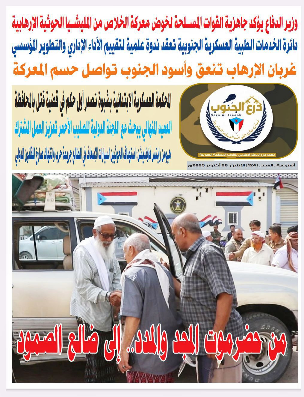رقم الاصدار/العدد 124 تاريخ الاصدار 2025-10-20 19:30:24 تصفح العدد (124) من صحيفة (درع الجنوب) الصادر اليوم الاثنين الموافق 20 أكتوبر 2025م
