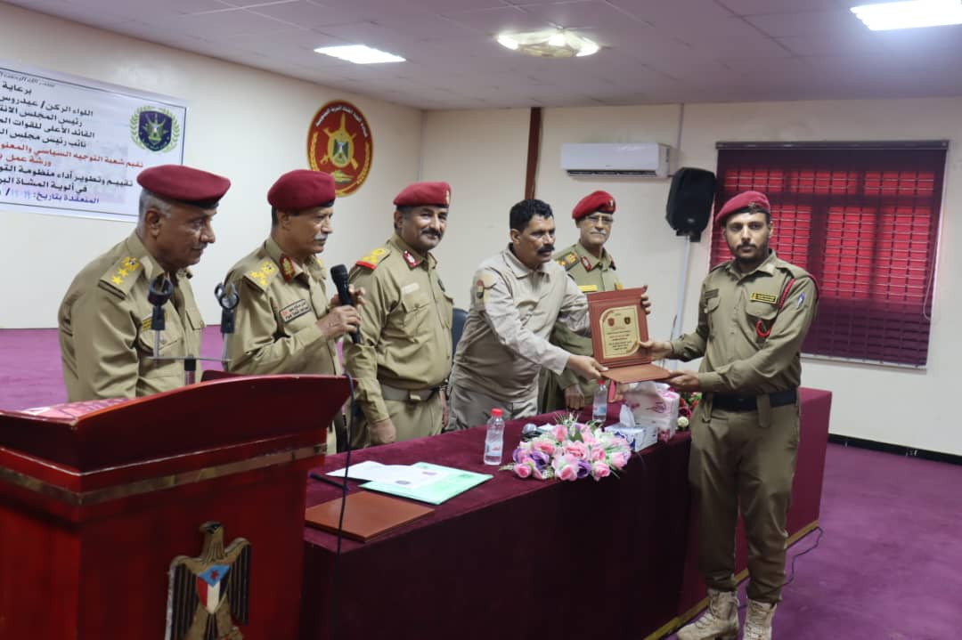 شعبة التوجيه السياسي والمعنوي للقوات البرية الجنوبية تختتم ورشة عمل بتوصيات تعزز بناء الوعي والروح القتالية