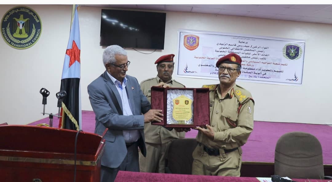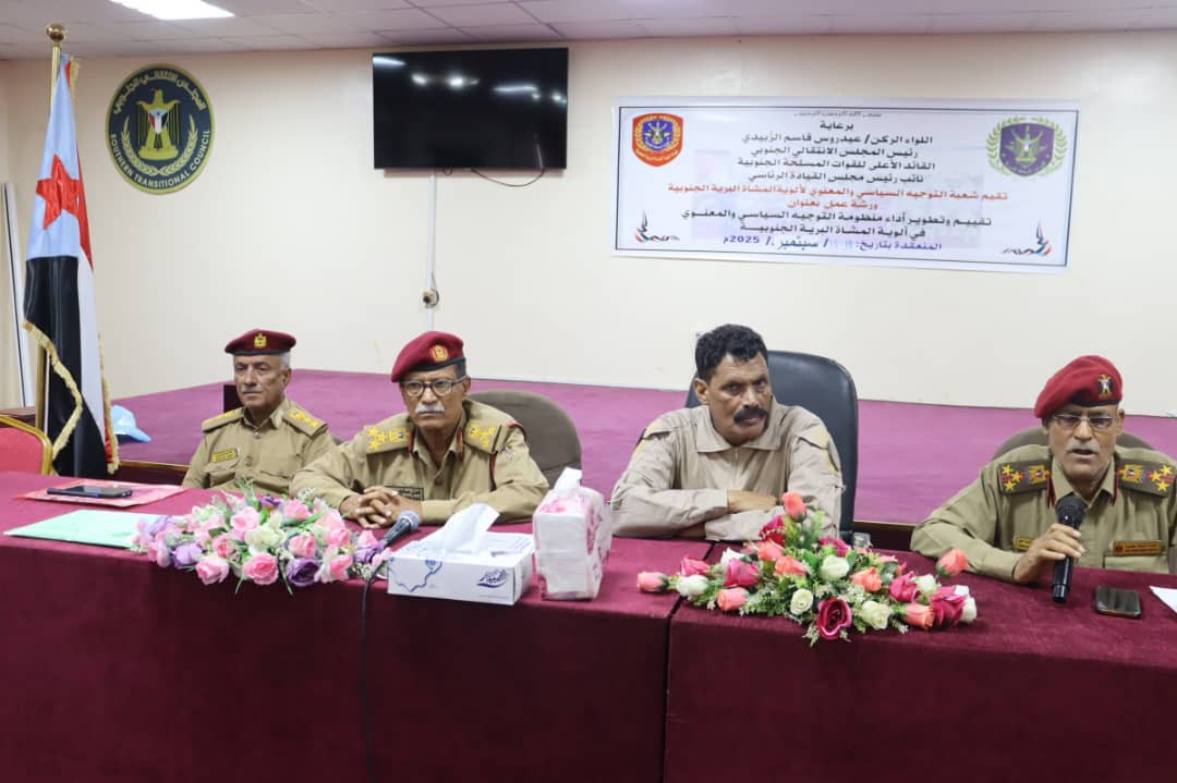برعاية الرئيس القائد عيدروس الزبيدي رئيس المجلس الانتقالي الجنوبي القائد الاعلى للقوات المسلحة الجنوبية، اختتمت شعبة التوجيه السياسي والمعنوي بالقوات البرية الجنوبية أعمال ورشة العمل الخاصة بتقييم وتطوير أداء منظومة التوجيه السياسي والمعنوي، والتي استمرت على مدى يومين متتاليين في أجواء اتسمت بالجدية وروح المسؤولية الوطنية.