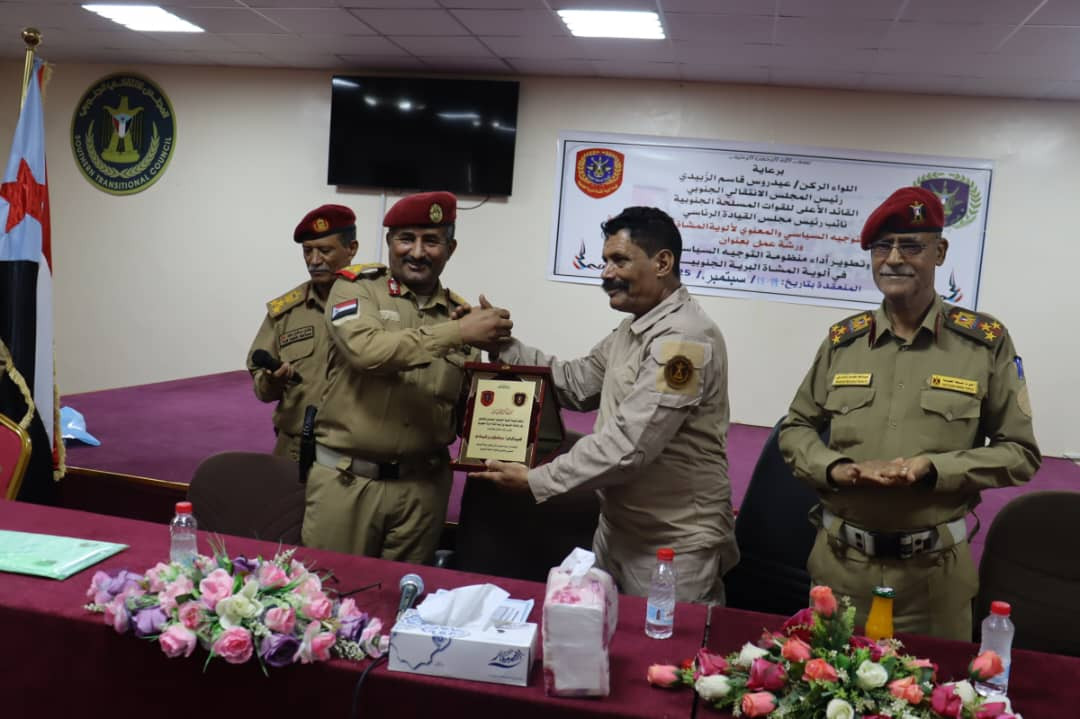 وفي ختام الورشة، جرى تكريم اللواء الركن سيف علي صالح مدير مكتب القائد الأعلى للقوات المسلحة الجنوبية، والعميد الركن عبدالعزيز الهدف أركان القوات البرية الجنوبية، والعميد الركن عبدالسلام البيحاني عمليات ألوية الحماية الرئاسية،