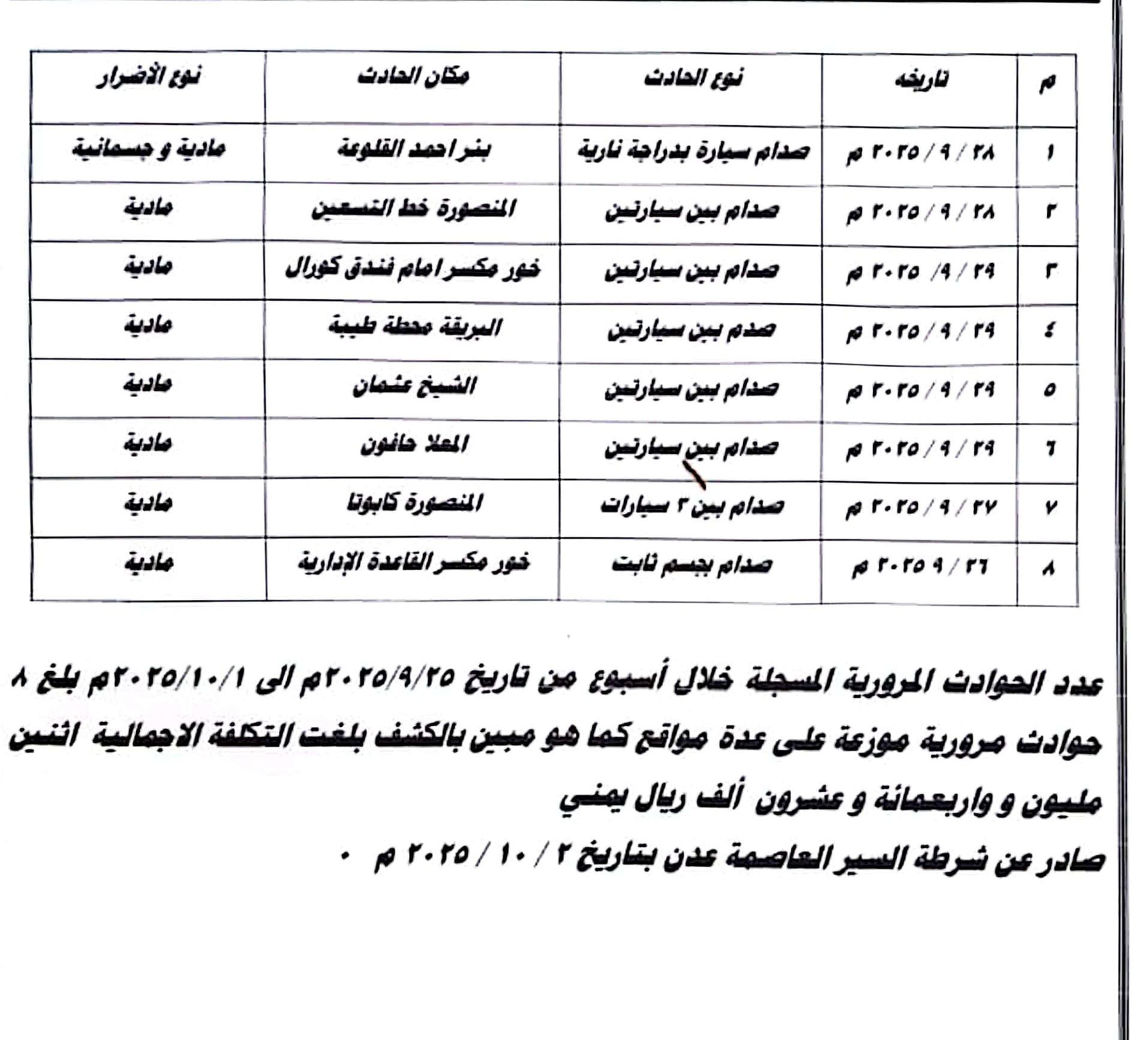 وأوضحت الإحصائية أن العاصمة عدن شهدت خلال الفترة نفسها (8) حوادث مرورية في عدد من المديريات، مسجّلة انخفاضًا بنسبة 43% مقارنة بالأسبوع السابق، مع تسجيل خسائر مادية قُدِّرت بنحو 2,420,000 ريال (مليونين وأربعمائة وعشرون ألف ريال).